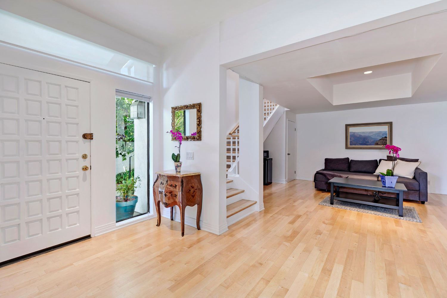 Open and airy end unit perched above and insulated from the street for a sense of serenity. This beautiful townhome features extra windows that allow for great natural light as well as maximizing the mountain views. All rooms are generously sized. Stunning maple solid wood floors are throughout most of the unit. Enter into an open living space with bonus/office and guest suite (2nd master) on main level. The center level offers a bright family room with high ceilings and fireplace, plus dining - both opening to patios. Spacious updated kitchen with stainless steel appliances, granite counters and glass mosaic backsplash, plus direct entry from the 2-car garage. The upper level boasts a gracious master suite with sitting area, true spa-like bath and balcony enjoying sweeping views of the majestic moutainscape. Another en suite completes the upper level. The Association includes a pool, spa and gym, as well as access to the private Highlands park and dog park.